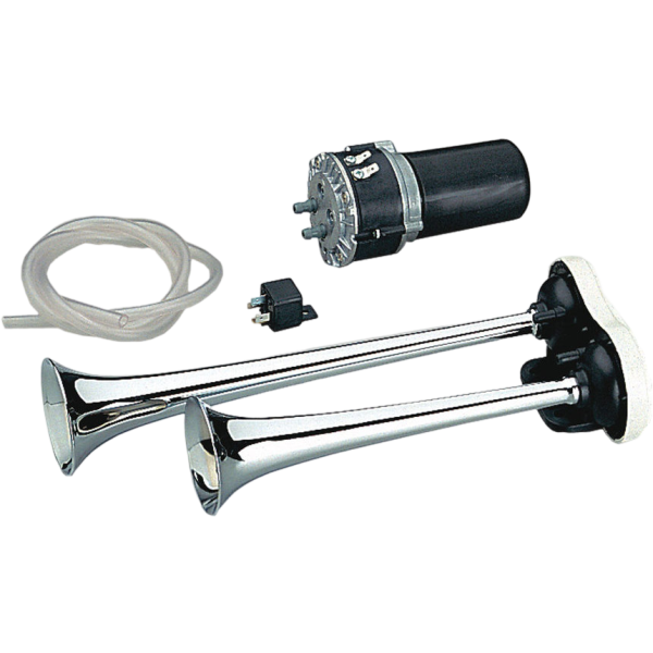 Otobüs benzeri, dönüşümlü sesli, elektrikli kompresör, röle, boru ve sabitleme donanımıyla donatılmış çift havalı korna. Metal krom trompetler. 12v ve 24v seçenekleri mevcuttur.